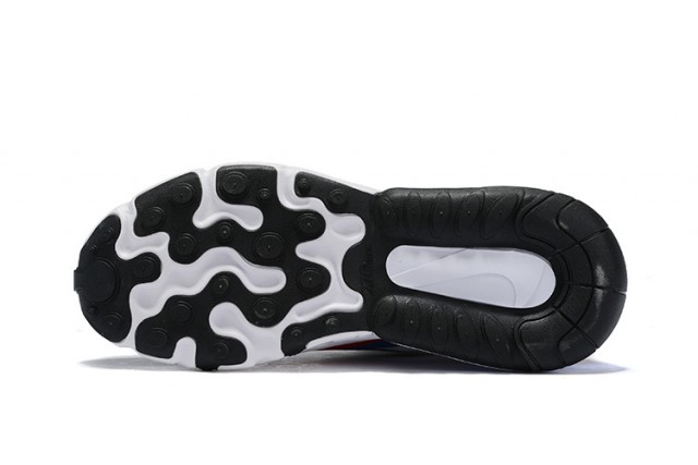 נעלי נייק Nike מדגם Air Max 270 React עם סוליית גומי יחודית בשילוב יחידת אוויר ובולם לריכוך הצעדים. לנעליים בד רשת לאוורור, שרוכי קשירה ולוגו נייקי מופיע על צידי הנעל ומאחור.